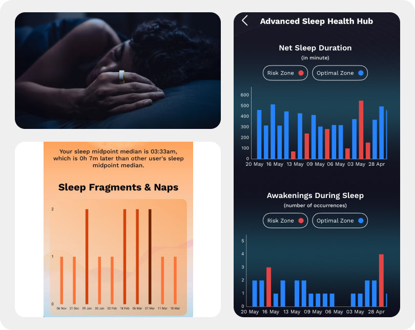 Rest better with aaboRing Pro’s Sleep AI, designed to help you understand your sleep patterns with sleep scores based on your body’s personal baselines and REM and light sleep-related insights.